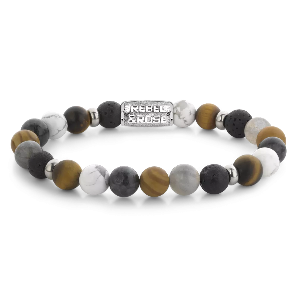 Bead armband, handgemaakt van 8mm stenen (Tijgeroog, Lava, Labradoriet, Grain Stone, Larvakiet, Howliet en kleine Stainless Steel elementen) met een zilverkleurige sluiting.
