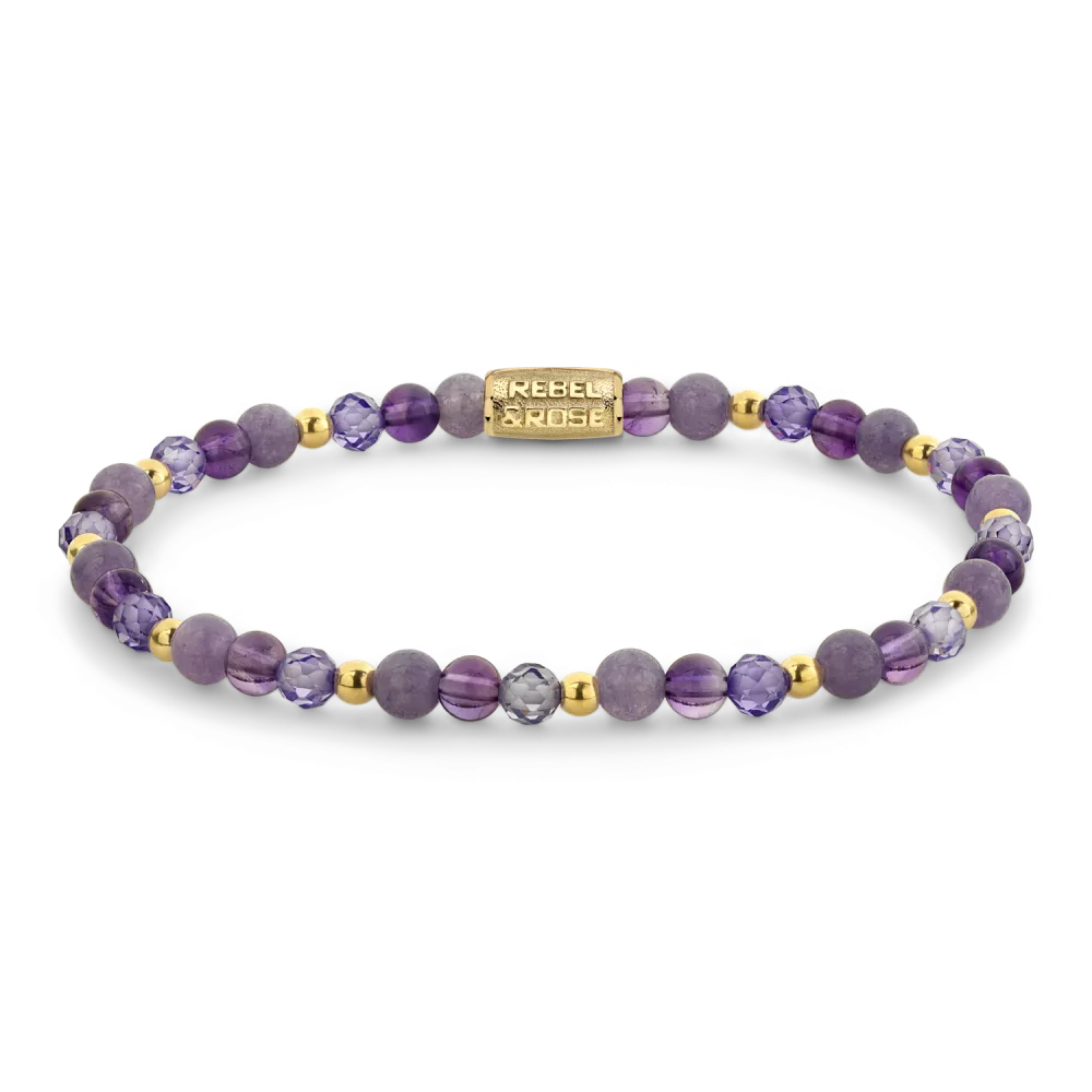Bead armband, handgemaakt van 4mm stenen (Amethyst, RVS ion-gold plated, Chalcedoon, Glas Rock) met een 18 karaat goud ion-plated edelstalen sluiting.