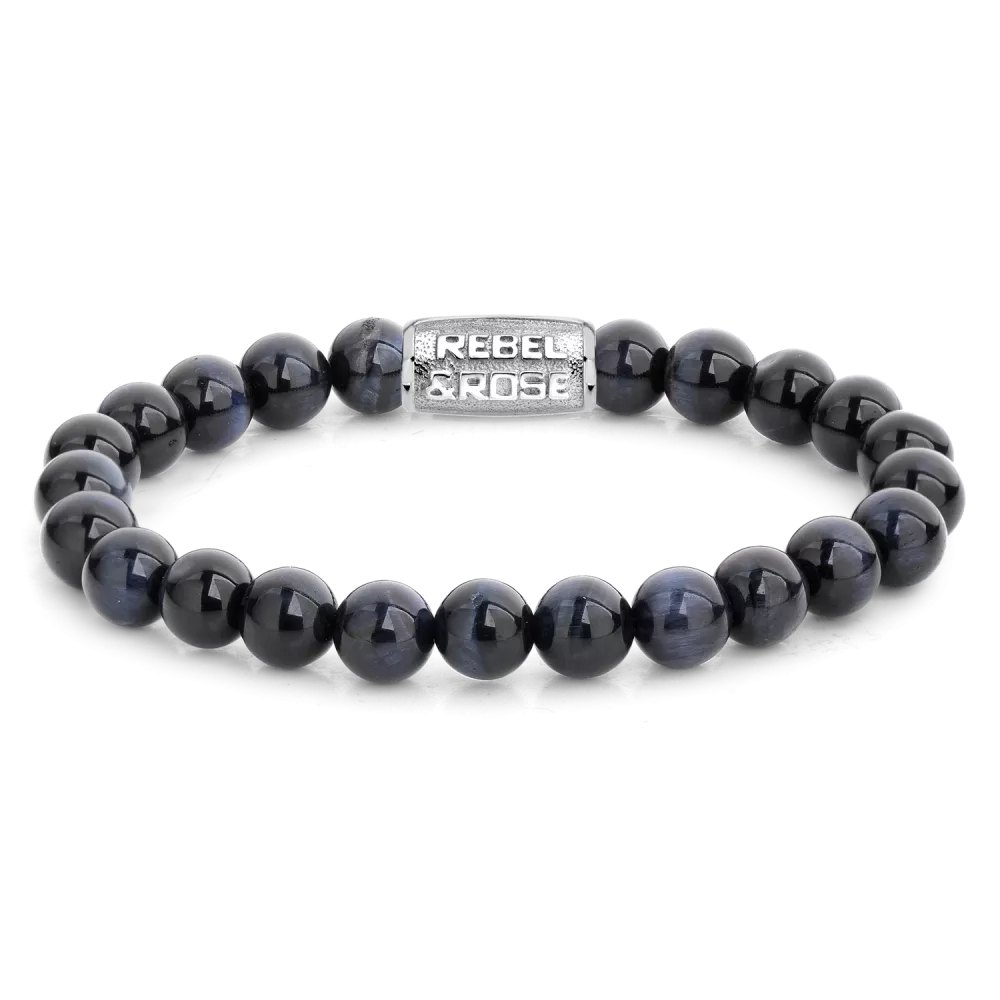 Bead armband, handgemaakt van 8mm blauwe Tijgeroog stenen met een zilverkleurige sluiting. Het Rebel & Rose sieraad is makkelijk te combineren met andere zilveren, leren of kralenarmbanden.
