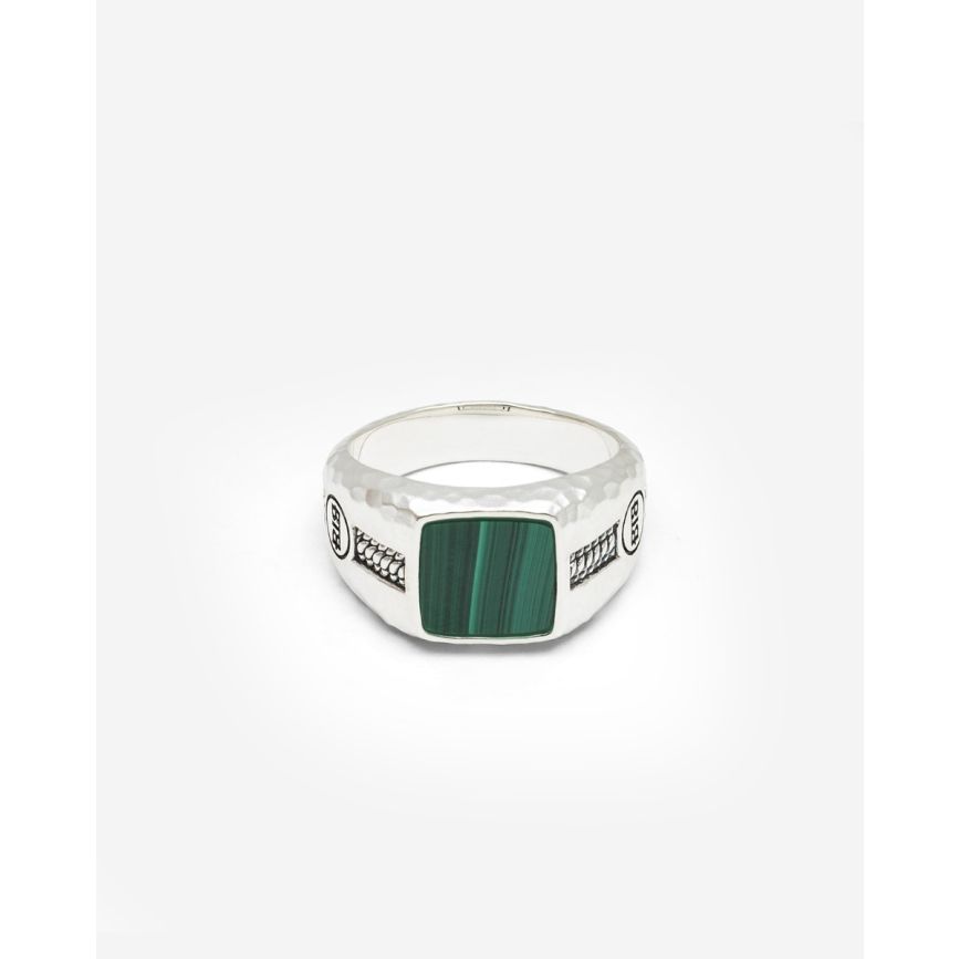 De Zilveren Tangguh Small Ring Malachiet is er voor iedereen die leeft vanuit innerlijke kracht en negatieve energie loslaat! Tangguh Small Ring is een verfijnde versie van de bestaande Tangguh Zegelring. Hiermee bouwt het verder aan de bestaande verhaallijn van een robuust en krachtig sieraad met een hamerslag-afwerking. De malachiet steen in de Tangguh Small Ring heeft tevens een helende werking. Malachiet stimuleert innerlijke groei, helpt bij emotionele verwerking en biedt bescherming tegen invloeden van buitenaf.