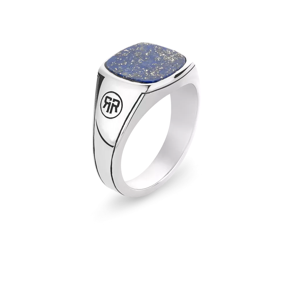 Sterling 925 zilveren zegelring, handgemaakt en met een vierkante blauwe Lapis Lazuli edelsteen van 12 x 12 mm. Het zilver is glanzend afgewerkt.