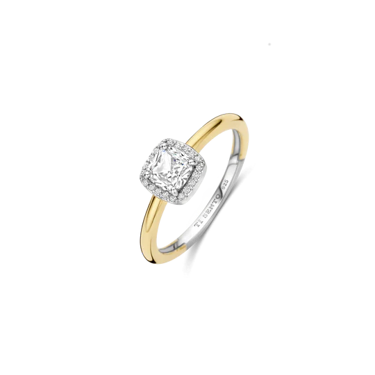 Ti Sento – Milano Ring 12388ZY. Verhoog dagelijkse elegantie met deze TI SENTO goudkleurig vergulde zilveren ring 12388ZY. Vervaardigd uit 925 sterling zilver, combineert de ring twee afwerkingen: stralend goudkleurig verguld op de bovenste curve en spiegelend platinakleurig op de onderzijde, voor een verfijnd spel van warmte en koele glans. In het midden prijkt een 7 mm fantasy-cut witte cubic zirconia, omringd door een micro-halo van pavé-steentjes die de luminantie van de edelsteen versterken. Het slanke profiel glijdt moeiteloos naast andere stackers en maakt toch een subtiel zelfverzekerde indruk wanneer het solo wordt gedragen. Nikkelvrij en hypoallergeen, deze ring combineert blijvende schittering met comfortabel draagplezier voor de hele dag.